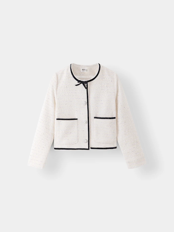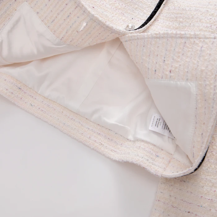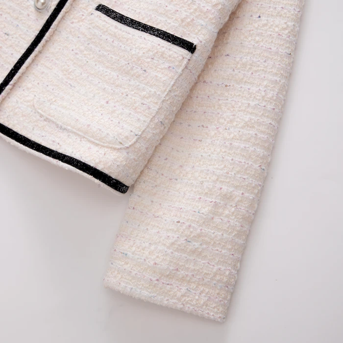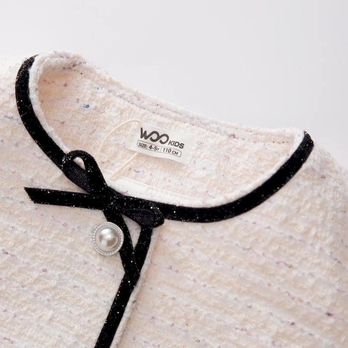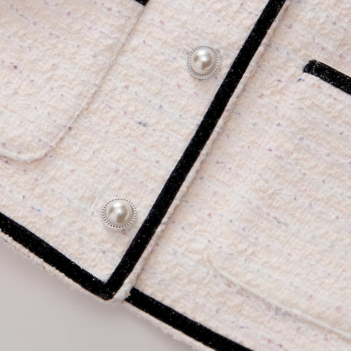 • Thiết kế: Áo dạ tweed đính nơ trên cổ, cúc ngọc trai